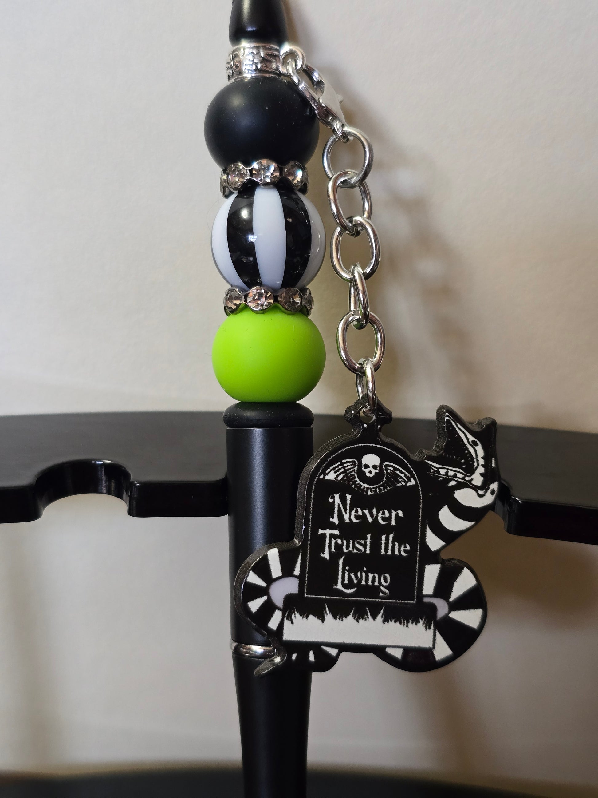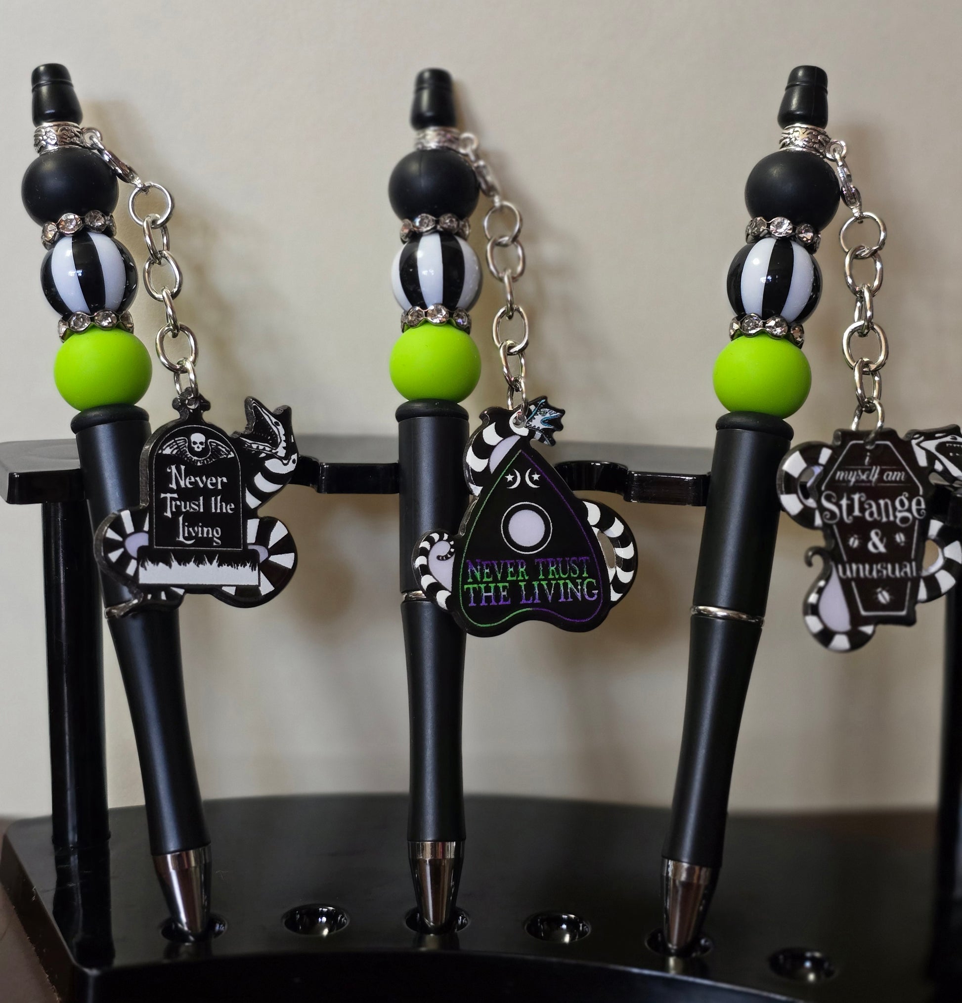 Each pen is crafted using high-quality silicone and acrylic beads, giving it a delightful weight, vibrant style, and a playful spooky vibe. The set includes three Beetlejuice quote charms, each one designed to capture the humor, weirdness, and beloved cult-classic spirit of the film.