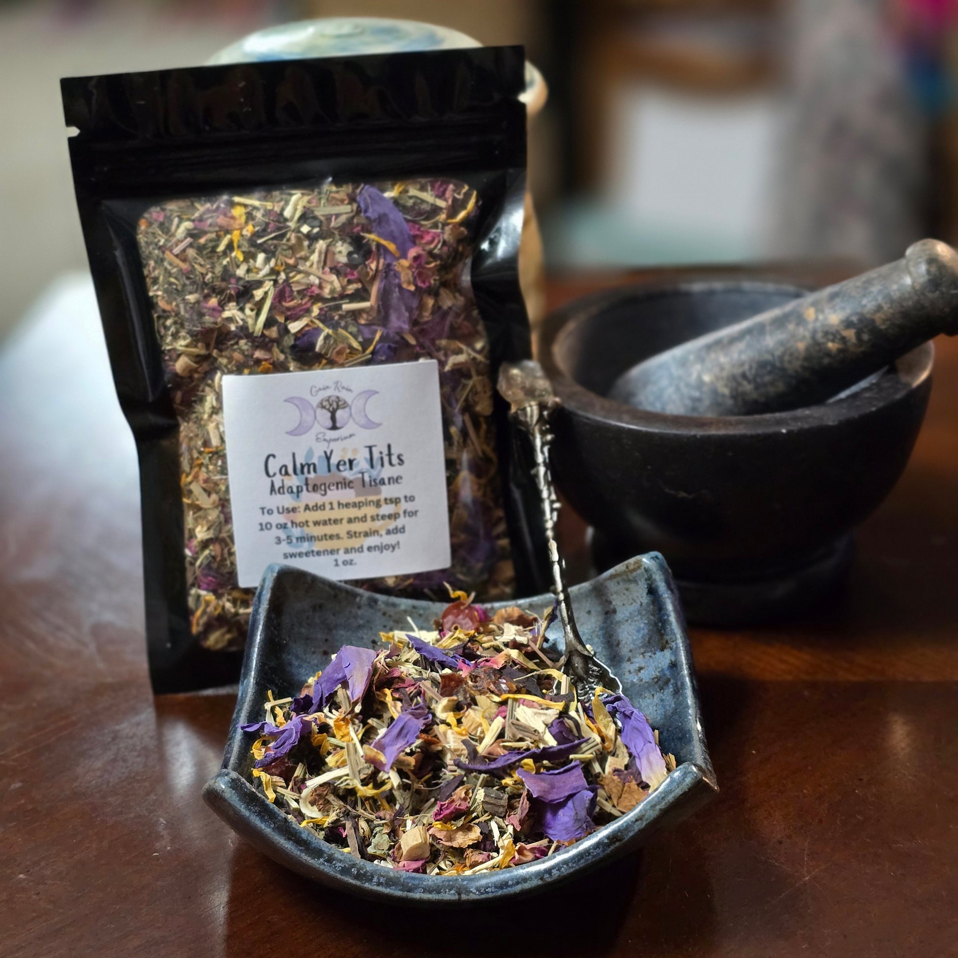 Unwind, breathe, and let the world fall away with Calm Yer Tits, a deeply soothing herbal tisane crafted with a powerful blend of adaptogenic herbs, calming florals, and grounding roots. This blend was created to support emotional balance, reduce stress, release tension, and help you relax at the end of a long, chaotic day.