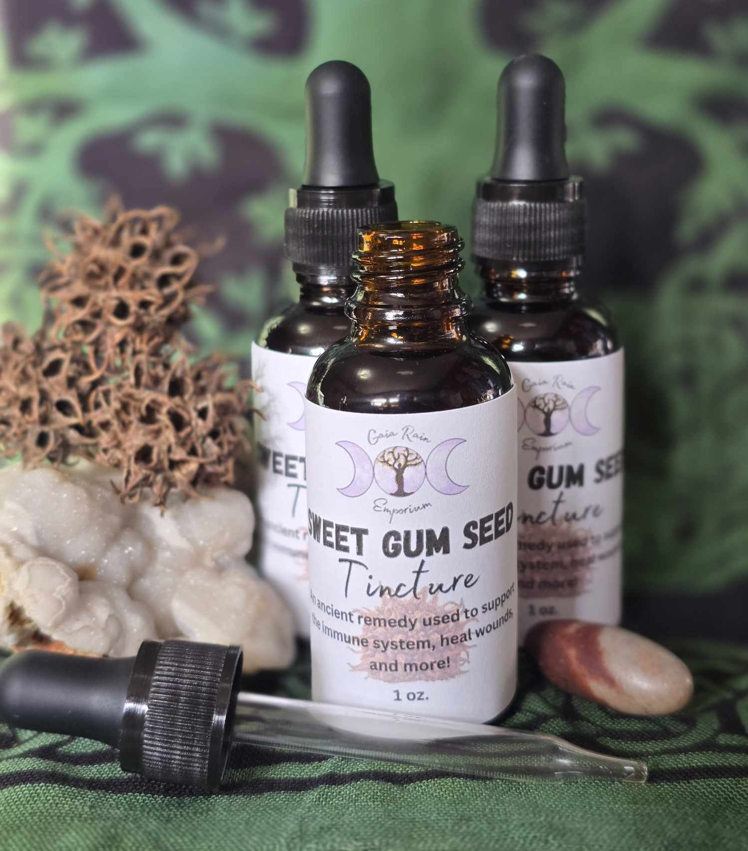 Discover the ancient wisdom of Sweet Gum Seed Tincture, a traditional remedy used for generationsâespecially among Indigenous peoplesâfor immune support, respiratory comfort, and skin wellness. This tincture is crafted from fresh, green sweet gum seed pods that I personally gathered ethically and organically, with no herbicides or pesticides used in the area.